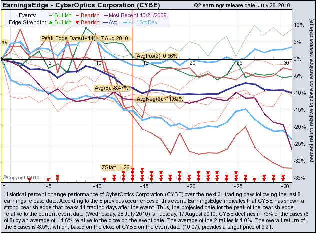 According to the 8 previous quarterly earnings reports, CYBE has shown a bearish edge that peaks 14 trading days after the report. CYBE drops in 75% of the cases (6 of 8) by an average of -11.6% relative to the date of the earnings release. At the time this story was written, CYBE is -3.18% immediately after earnings were released.