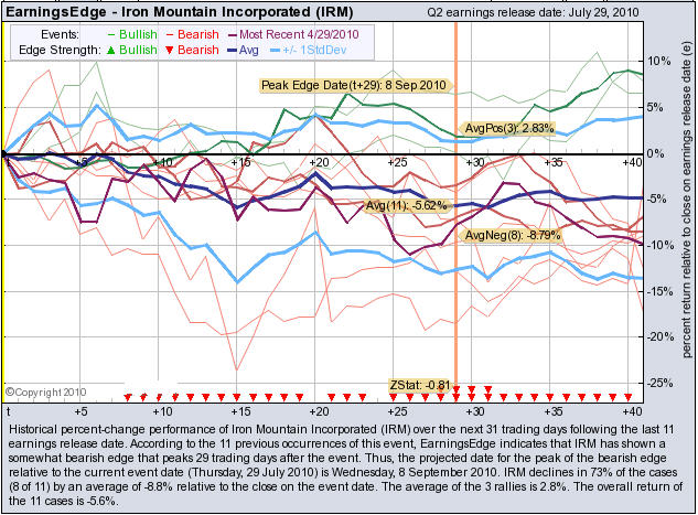 According to the 11 previous quarterly earnings reports, IRM has shown a bearish edge that peaks 29 trading days after the report. IRM drops in 73% of the cases (8 of 11) by an average of -8.8% relative to the date of the earnings release. At the time this story was written, IRM is -5.46% immediately after earnings were released.