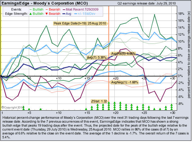 According to the 7 previous July earnings reports, (NYSE: MCO) has shown a bullish edge that peaks 19 trading days after the report. MCO rallies in 86% of the cases (6 of 7) by an average of +6.6% relative to the date of the earnings release. At the time this story was written, MCO is +4.24% immediately after earnings were released.