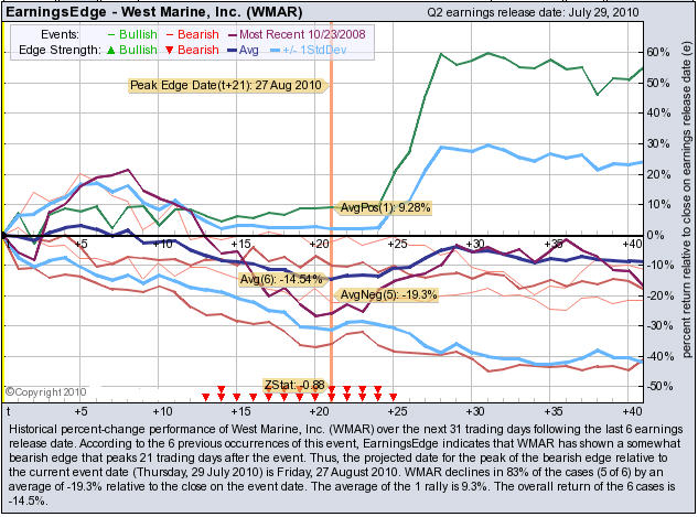 According to the 6 previous quarterly earnings reports, WMAR has shown a bearish edge that peaks 21 trading days after the report. WMAR drops in 83% of the cases (5 of 6) by an average of -19.3% relative to the date of the earnings release. At the time this story was written, WMAR is -4.68% immediately after earnings were released.