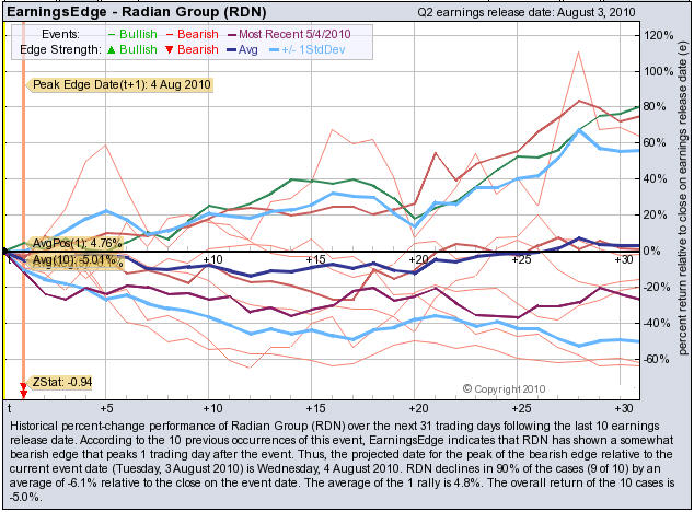 According to the 10 previous quarterly earnings reports, RDN has shown a bearish edge that peaks 1 trading days after the report. RDN drops in 90% of the cases (9 of 10) by an average of -6.1% relative to the date of the earnings release. At the time this story was written, RDN is -19.35% immediately after earnings were released.