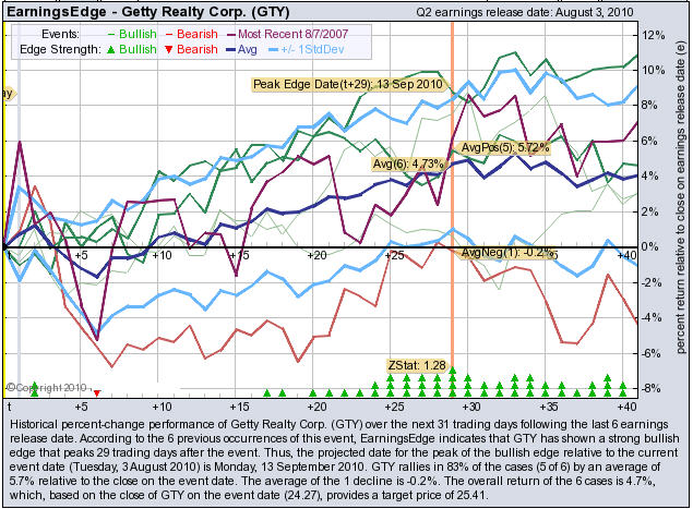 According to the 6 previous August earnings reports, GTY has shown a bullish edge that peaks 29 trading days after the report. GTY rallies in 83% of the cases (5 of 6) by an average of +5.7% relative to the date of the earnings release. At the time this story was written, GTY is +0.60% immediately after earnings were released.