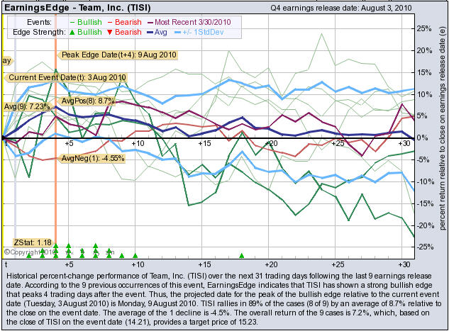 According to the 9 previous quarterly earnings reports, TISI has shown a bullish edge that peaks 4 trading days after the report. TISI rallies in 89% of the cases (8 of 9) by an average of +8.7% relative to the date of the earnings release. At the time this story was written, TISI is +13.48% immediately after earnings were released.