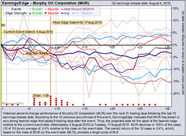 According to the 10 previous quarterly earnings reports, MUR has shown a bearish edge that peaks 9 trading days after the report. MUR drops in 100% of the cases (10 of 10) by an average of -3.4% relative to the date of the earnings release. At the time this story was written, MUR is -0.95% immediately after earnings were released.