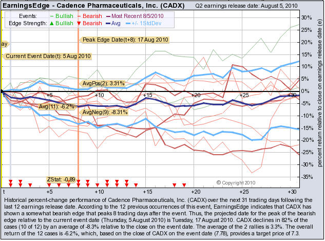 August 6, 2010 / M2 PRESSWIRE / BUYINS.NET, www.buyins.net , a provider of unique trading technologies, released a report on August 4, 2010 at 6:49 am PDT stating that Cadence Pharmaceuticals (NASDAQ: CADX) was expected to be lower after its earnings were released after the close on Thursday, August 5, 2010. Click here to view the BUYINS.NET report: http://www.buyins.net/releases/?id=119315