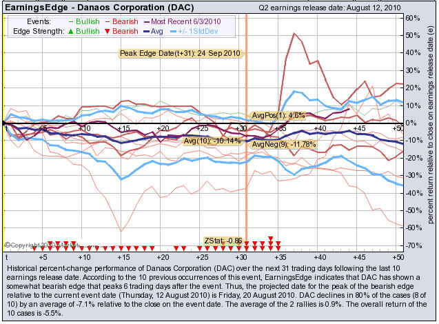 According to the 10 previous quarterly earnings reports, DAC has shown a bearish edge that peaks 6 trading days after the report. DAC drops in 80% of the cases (8 of 10) by an average of -7.1% relative to the date of the earnings release. At the time this story was written, DAC is -3.0% immediately after earnings were released.