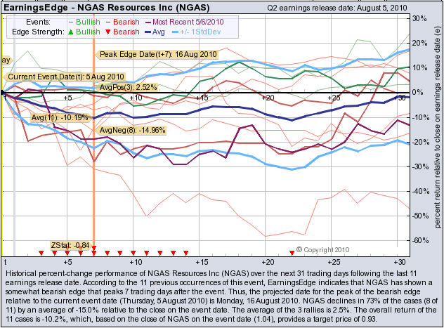 According to the 11 previous quarterly earnings reports, NGAS has shown a bearish edge that peaks 7 trading days after the report. NGAS drops in 73% of the cases (8 of 11) by an average of -15.0% relative to the date of the earnings release. At the time this story was written, NGAS is -1.92% immediately after earnings were released.