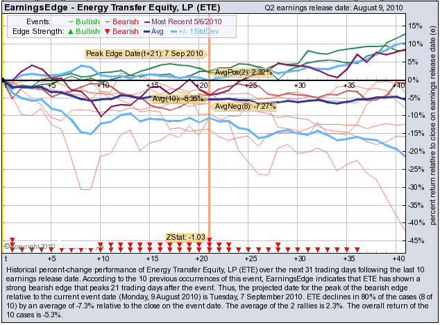 According to the 10 previous quarterly earnings reports, ETE has shown a bearish edge that peaks 21 trading days after the report. ETE drops in 80% of the cases (8 of 10) by an average of -7.3% relative to the date of the earnings release. At the time this story was written, ETE is -3.01% immediately after earnings were released.