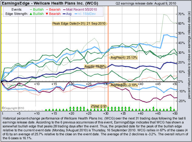 According to the 6 previous quarterly earnings reports, WCG has shown a bullish edge that peaks 28 trading days after the report. WCG rallies in 67% of the cases (4 of 6) by an average of +25.7% relative to the date of the earnings release. At the time this story was written, WCG is +5.88% immediately after earnings were released.