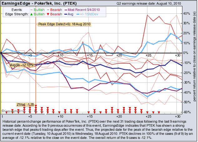 According to the 9 previous quarterly earnings reports, PTEK has shown a bearish edge that peaks 6 trading days after the report. PTEK drops in 100% of the cases (9 of 9) by an average of -12.1% relative to the date of the earnings release. At the time this story was written, PTEK is -10.65% immediately after earnings were released.