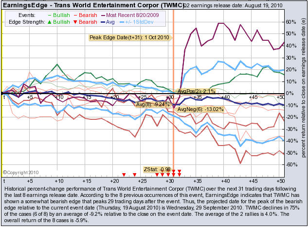 According to the 8 previous quarterly earnings reports, TWMC has shown a bearish edge that peaks 29 trading days after the report. TWMC drops in 75% of the cases (6 of 8) by an average of -9.2% relative to the date of the earnings release. At the time this story was written, TWMC is -9.77% immediately after earnings were released.