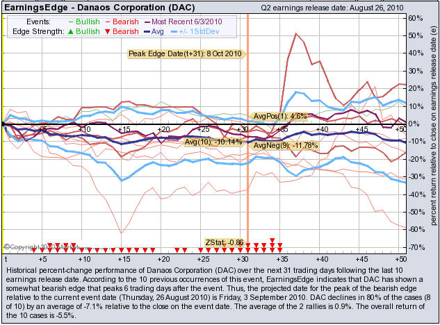 According to the 10 previous quarterly earnings reports, DAC has shown a bearish edge that peaks 6 trading days after the report. DAC drops in 80% of the cases (8 of 10) by an average of -7.1% relative to the date of the earnings release. At the time this story was written, DAC is -1.23% immediately after earnings were released.