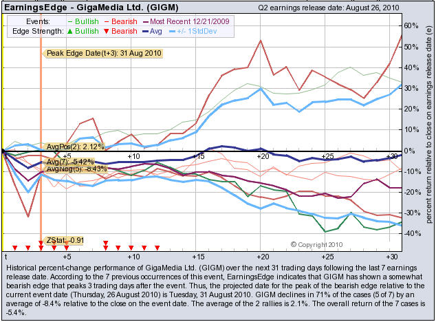 According to the 7 previous quarterly earnings reports, GIGM has shown a bearish edge that peaks 3 trading days after the report. GIGM drops in 71% of the cases (5 of 7) by an average of -8.4% relative to the date of the earnings release. At the time this story was written, GIGM is -7.21% immediately after earnings were released.