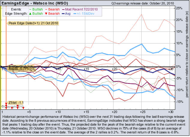 According to the 8 previous quarterly earnings reports, WSO has shown a bearish edge that peaks 1 trading day after the report. WSO drops in 75% of the cases (6 of 8) by an average of -1.1% relative to the date of the earnings release. At the time this story was written, WSO is -4.12% immediately after earnings were released.