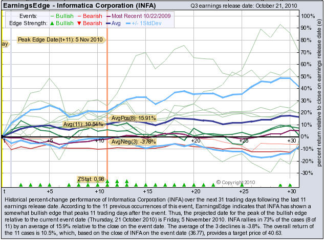 According to the 11 previous October earnings reports, INFA has shown a bullish edge that peaks 11 trading days after the report. INFA rallies in 73% of the cases (8 of 11) by an average of +15.9% relative to the date of the earnings release. At the time this story was written, INFA is +3.75% immediately after earnings were released.