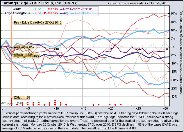 According to the 8 previous quarterly earnings reports, DSPG has shown a bearish edge that peaks 2 trading days after the report. DSPG drops in 88% of the cases (7 of 8) by an average of -5.5% relative to the date of the earnings release. At the time this story was written, DSPG is -6.52% immediately after earnings were released.