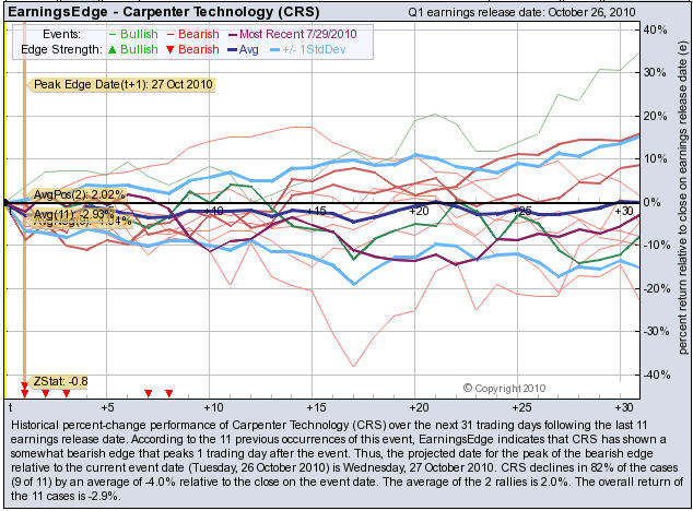 According to the 11 previous quarterly earnings reports, CRS has shown a bearish edge that peaks 1 trading day after the report. CRS drops in 82% of the cases (9 of 11) by an average of -4.0% relative to the date of the earnings release. At the time this story was written, CRS is -3.24% immediately after earnings were released.
