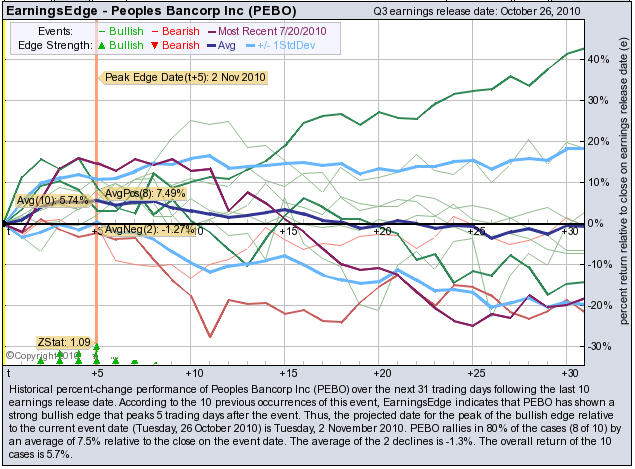 According to the 10 previous quarterly earnings reports, PEBO has shown a bullish edge that peaks 5 trading days after the report. PEBO rallies in 80% of the cases (8 of 10) by an average of +7.5% relative to the date of the earnings release. At the time this story was written, PEBO is +2.68% immediately after earnings were released.