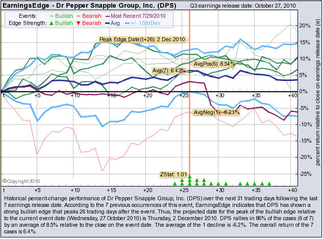 According to the 7 previous quarterly earnings reports, DPS has shown a bullish edge that peaks 26 trading days after the report. DPS rallies in 86% of the cases (6 of 7) by an average of +8.5% relative to the date of the earnings release. At the time this story was written, DPS is +0.79% immediately after earnings were released.