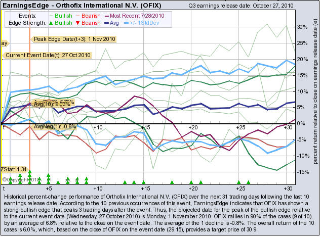 According to the 10 previous quarterly earnings reports, OFIX has shown a bullish edge that peaks 3 trading days after the report. OFIX rallies in 90% of the cases (9 of 10) by an average of +6.8% relative to the date of the earnings release. At the time this story was written, OFIX is +2.54% immediately after earnings were released.