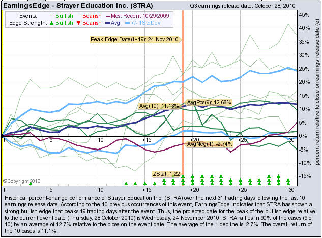 According to the 10 previous October earnings reports, STRA has shown a bullish edge that peaks 19 trading days after the report. STRA rallies in 90% of the cases (9 of 10) by an average of +12.7% relative to the date of the earnings release. At the time this story was written, STRA is +1.55% immediately after earnings were released.