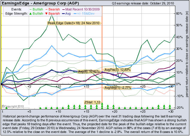 According to the 8 previous October earnings reports, AGP has shown a bullish edge that peaks 18 trading days after the report. AGP rallies in 88% of the cases (7 of 8) by an average of +12.5% relative to the date of the earnings release. At the time this story was written, AGP is +2.44% immediately after earnings were released.