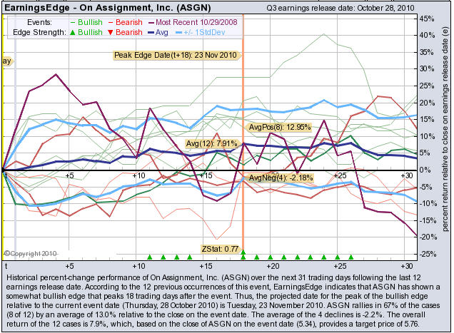 According to the 12 previous October earnings reports, ASGN has shown a bullish edge that peaks 18 trading days after the report. ASGN rallies in 67% of the cases (8 of 12) by an average of +13.0% relative to the date of the earnings release. At the time this story was written, ASGN is +5.43% immediately after earnings were released.