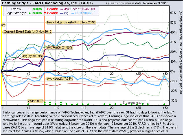 According to the 7 previous November earnings reports, FARO has shown a bullish edge that peaks 8 trading days after the report. FARO rallies in 71% of the cases (5 of 7) by an average of +24.9% relative to the date of the earnings release. At the time this story was written, FARO is +2.97% immediately after earnings were released.