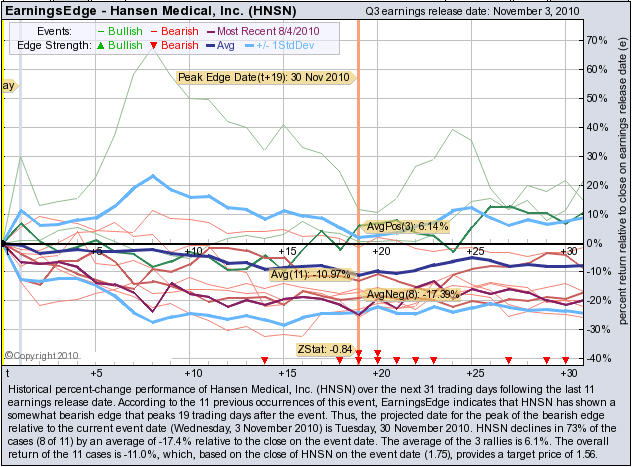 According to the 11 previous quarterly earnings reports, HNSN has shown a bearish edge that peaks 19 trading days after the report. HNSN drops in 73% of the cases (8 of 11) by an average of -17.4% relative to the date of the earnings release. At the time this story was written, HNSN is -4.57% immediately after earnings were released.