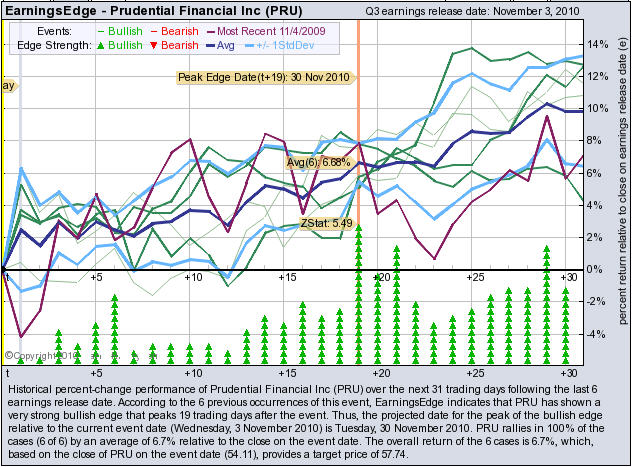 According to the 6 previous November earnings reports, PRU has shown a bullish edge that peaks 19 trading days after the report. PRU rallies in 100% of the cases (6 of 6) by an average of +6.7% relative to the date of the earnings release. At the time this story was written, PRU is +1.92% immediately after earnings were released.