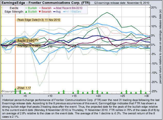 According to the 8 previous quarterly earnings reports, FTR has shown a bullish edge that peaks 3 trading days after the report. FTR rallies in 75% of the cases (6 of 8) by an average of +2.8% relative to the date of the earnings release. At the time this story was written, FTR is +2.61% immediately after earnings were released.
