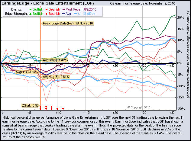 According to the 11 previous quarterly earnings reports, LGF has shown a bearish edge that peaks 7 trading days after the report. LGF drops in 73% of the cases (8 of 11) by an average of -5.8% relative to the date of the earnings release. At the time this story was written, LGF is -0.59% immediately after earnings were released.