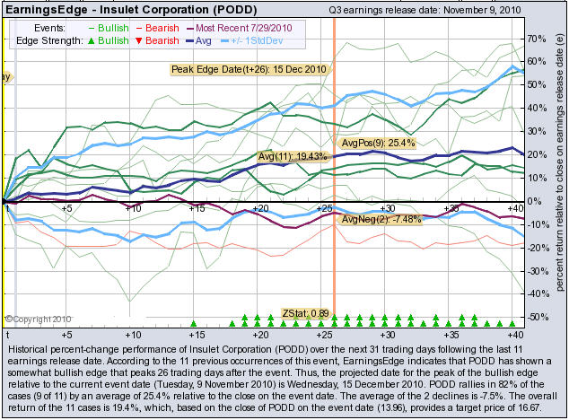 According to the 11 previous quarterly earnings reports, PODD has shown a bullish edge that peaks 26 trading days after the report. PODD rallies in 82% of the cases (9 of 11) by an average of +25.4% relative to the date of the earnings release. At the time this story was written, PODD is +3.87% immediately after earnings were released.