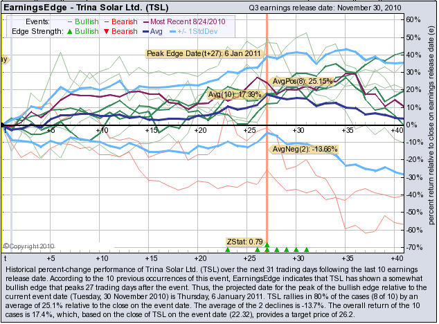 According to the 10 previous quarterly earnings reports, TSL has shown a bullish edge that peaks 27 trading days after the report. TSL rallies in 80% of the cases (8 of 10) by an average of +25.1% relative to the date of the earnings release. At the time this story was written, TSL is +2.69% immediately after earnings were released.