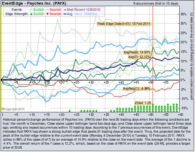 December 8, 2010 / M2 PRESSWIRE / BUYINS.NET, www.buyins.net , a provider of unique trading technologies, ran a reverse engineering trading scan on Paychex (NASDAQ: PAYX) on December 6, 2010 after the market closed. The scan predicted PAYX would go 14.9% higher by February 15, 2011 because trading conditions similar to those on or around December 6th had occurred 7 times in the past and 6 times (86%) the stock rose an average of 14.9% within 51 trading days.