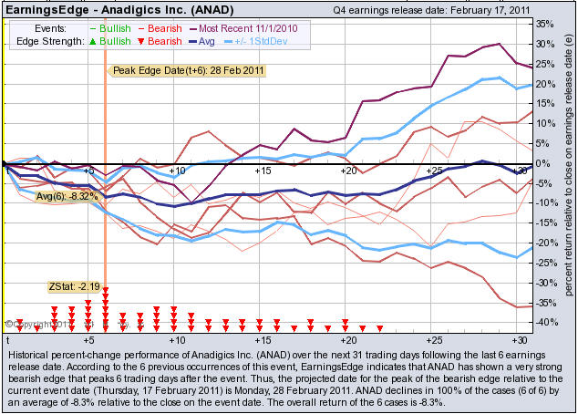According to the 6 previous quarterly earnings reports, ANAD has shown a bearish edge that peaks 6 trading days after the report. ANAD drops in 100% of the cases (6 of 6) by an average of -8.3% relative to the date of the earnings release. At the time this story was written, ANAD is -5.05% immediately after earnings were released.