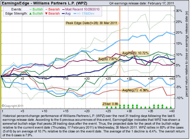 According to the 6 previous quarterly earnings reports, WPZ has shown a bullish edge that peaks 28 trading days after the report. WPZ rallies in 83% of the cases (5 of 6) by an average of +10.7% relative to the date of the earnings release. At the time this story was written, WPZ is +0.98% immediately after earnings were released.